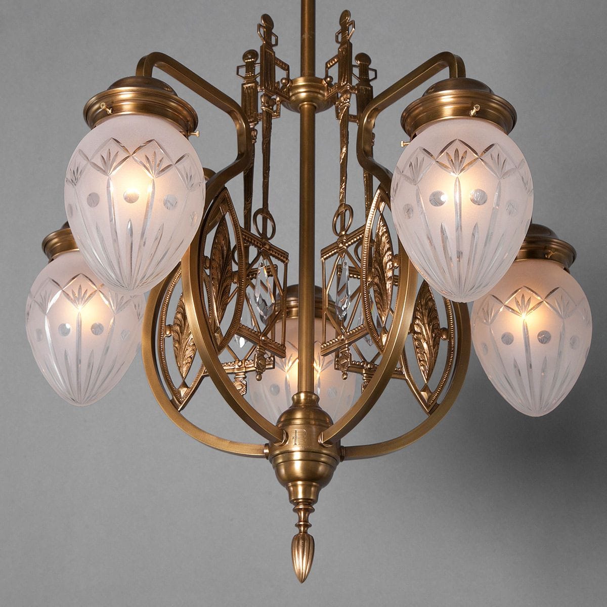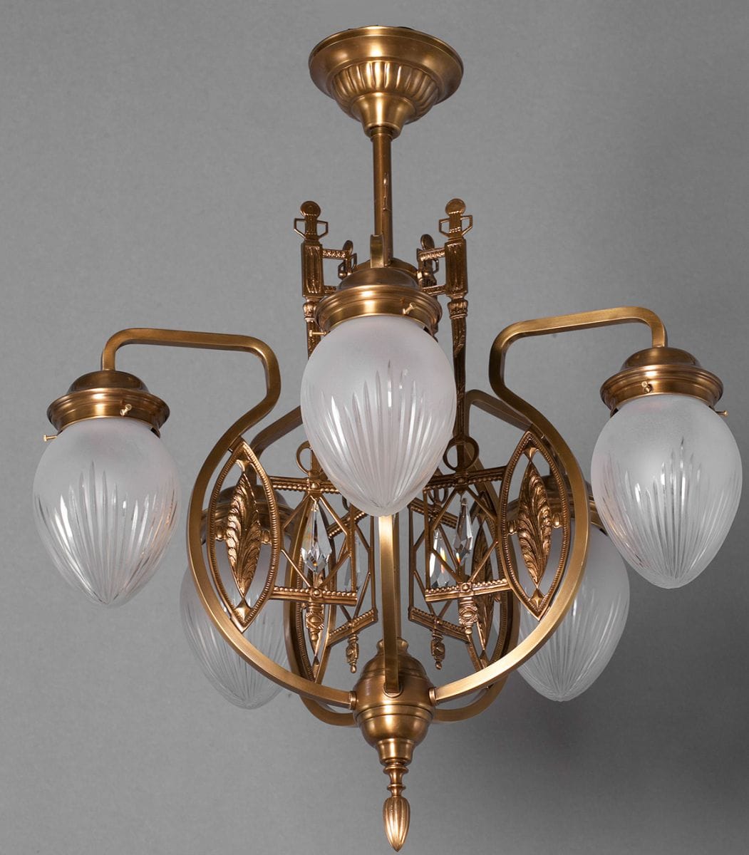 Ce chandelier plafonnier au style Art Nouveau allie raffinement, lumière chaleureuse et artisanat de qualité. Conçu en laiton massif et orné de verre satiné en forme de goutte, il est également décoré de feuilles ornementales et de pendentifs en cristal, créant un effet lumineux et élégant dans toute pièce. Sa structure à cinq bras assure une diffusion harmonieuse de la lumière, idéale pour un salon, une salle à manger ou tout espace nécessitant une touche décorative et un éclairage de caractère.