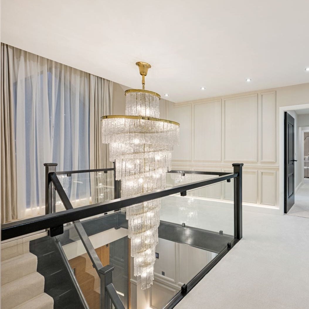 Grand lustre cristal salle au design baroque spectaculaire pour sublimer les escaliers en colimaçon et les grands volumes