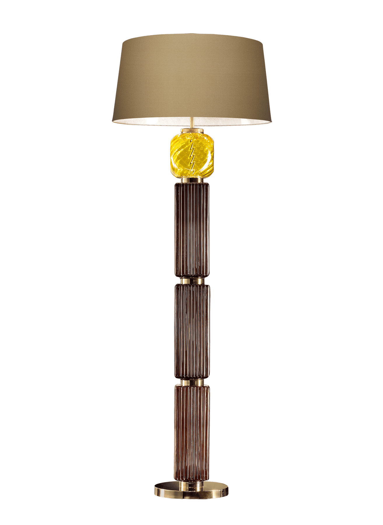 • Finitions : métal or clair, corps verre disponible en jaune ou taupe, abat-jour marron taupe