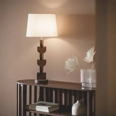 La Lampe à Poser Bois Dagmar se distingue par sa base en bois massif sculpté et ses volumes organiques empilés qui créent une présence sculpturale unique. L’abat-jour tronconique en tissu blanc adoucit l’éclairage et diffuse une lumière chaude et accueillante, parfaite pour structurer vos espaces tout en apportant charme et authenticité. Cette lampe ne se contente pas d’éclairer : elle devient un véritable élément décoratif qui apporte caractère et personnalité aux salons, chambres, coins lecture ou buffets. Chaque pièce est façonnée à la main, offrant un grain et des nuances uniques qui soulignent l’artisanat et l’originalité du produit.