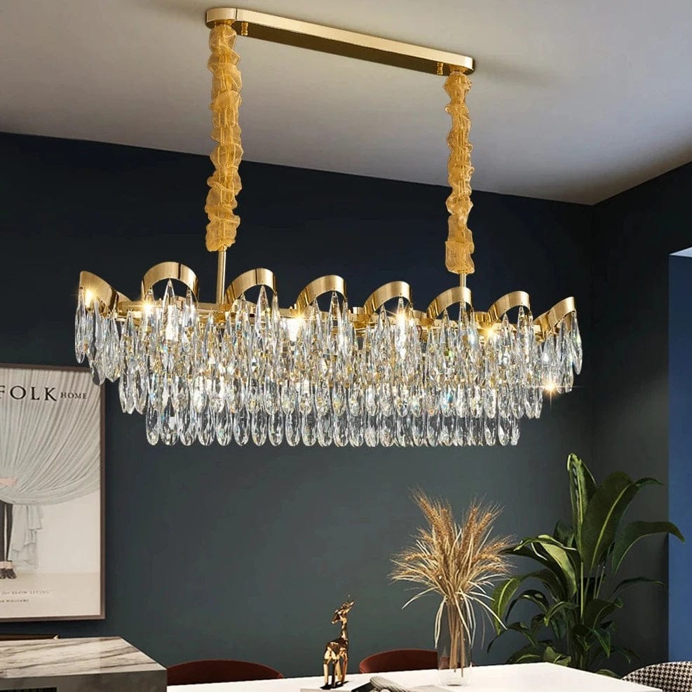 Lustre long pour salon à gouttes de cristal au style contemporain pour une mise en scène lumineuse élégante