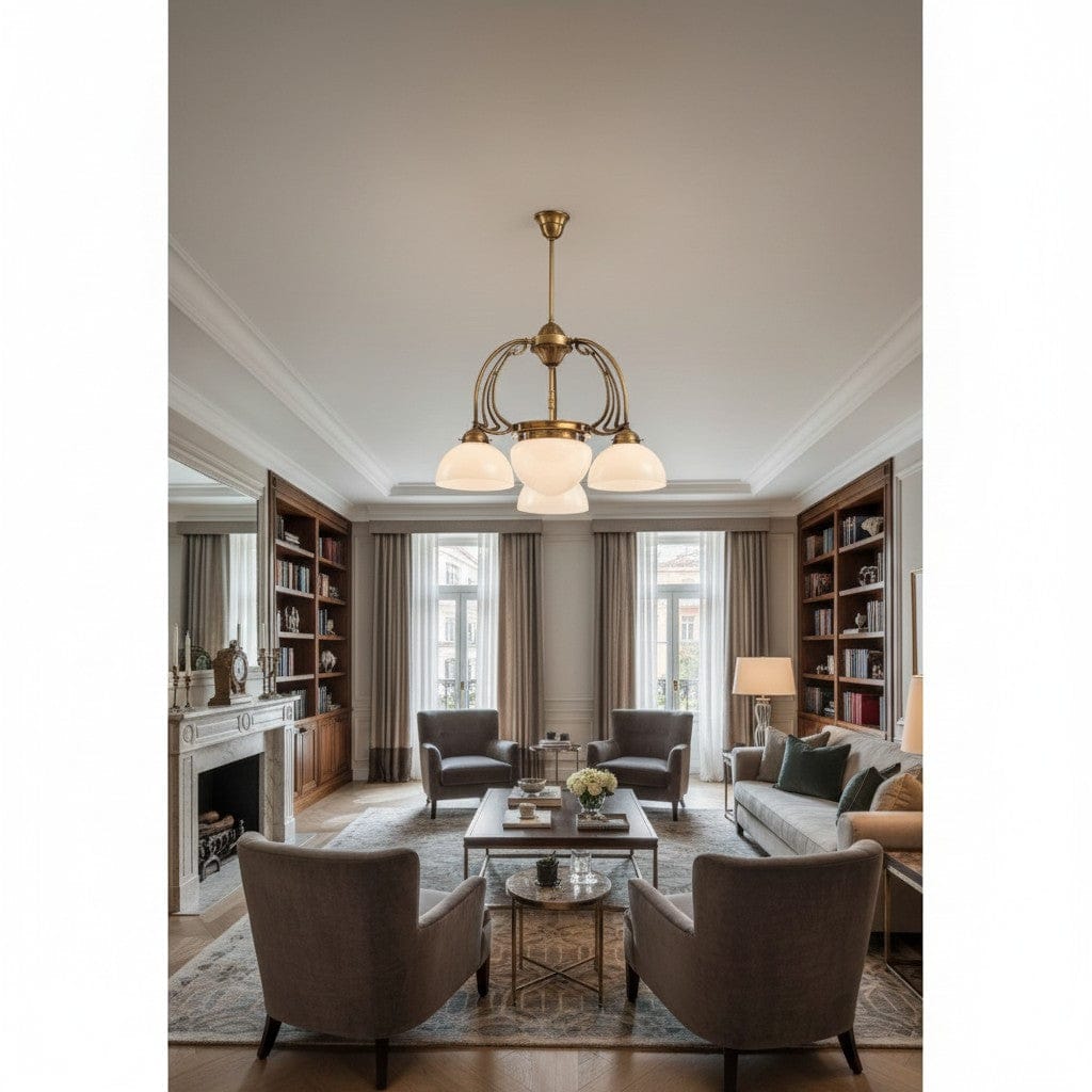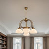 Découvrez un plafonnier en laiton massif artisanal combinant lignes classiques, verres soufflés artisanaux et élégance intemporelle pour créer une ambiance lumineuse sophistiquée