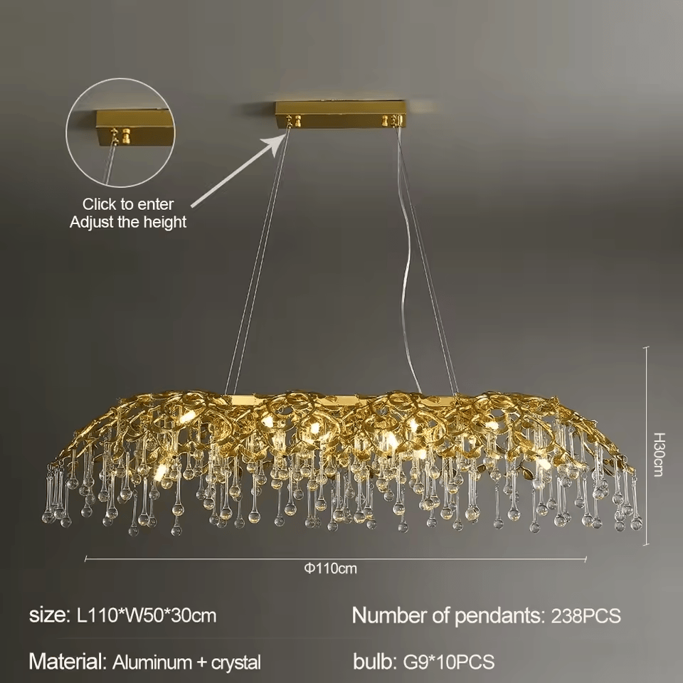 Ce plafonnier de grande taille illumine de manière spectaculaire tout en s'intégrant harmonieusement à des espaces modernes. Son design épuré et ses cristaux en pluie ajoutent du charme à votre salon ou salle à manger. Il est conçu pour offrir une ambiance chaleureuse grâce à l’éclairage LED intégré.