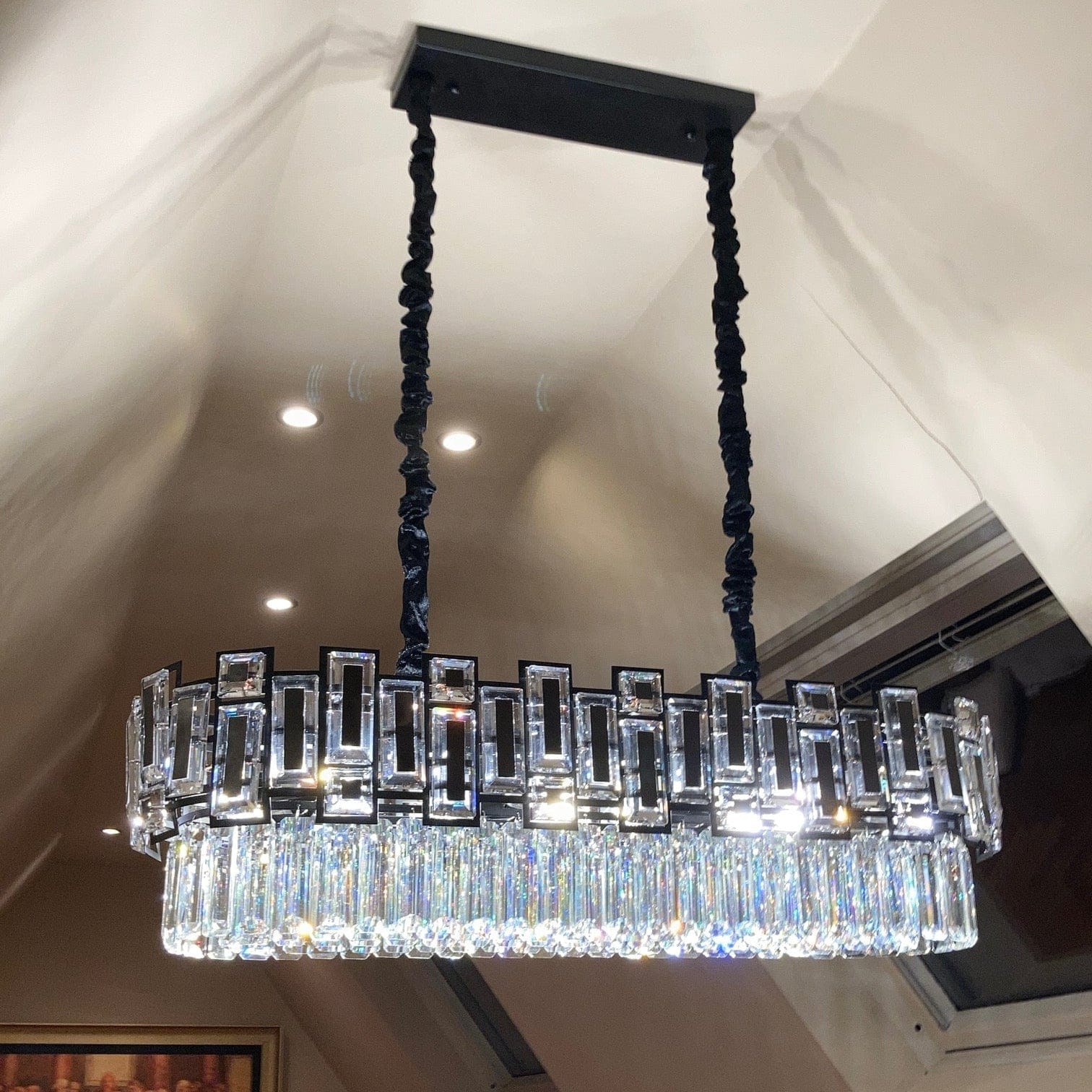 Ce plafonnier pour table à manger en cristal apporte l’élégance et le raffinement nécessaires pour transformer votre salle à manger en un espace sophistiqué. Les cristaux rectangulaires et carrés disposés harmonieusement autour du luminaire et les cristaux arrondis en dessous reflètent la lumière avec éclat, créant une atmosphère chaleureuse et luxueuse. Idéal pour les intérieurs modernes ou contemporains, ce luminaire devient un point focal décoratif qui met en valeur votre mobilier et votre décoration.