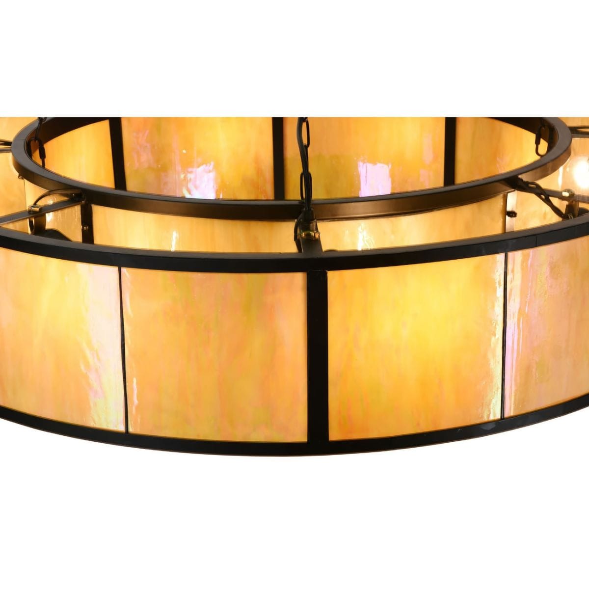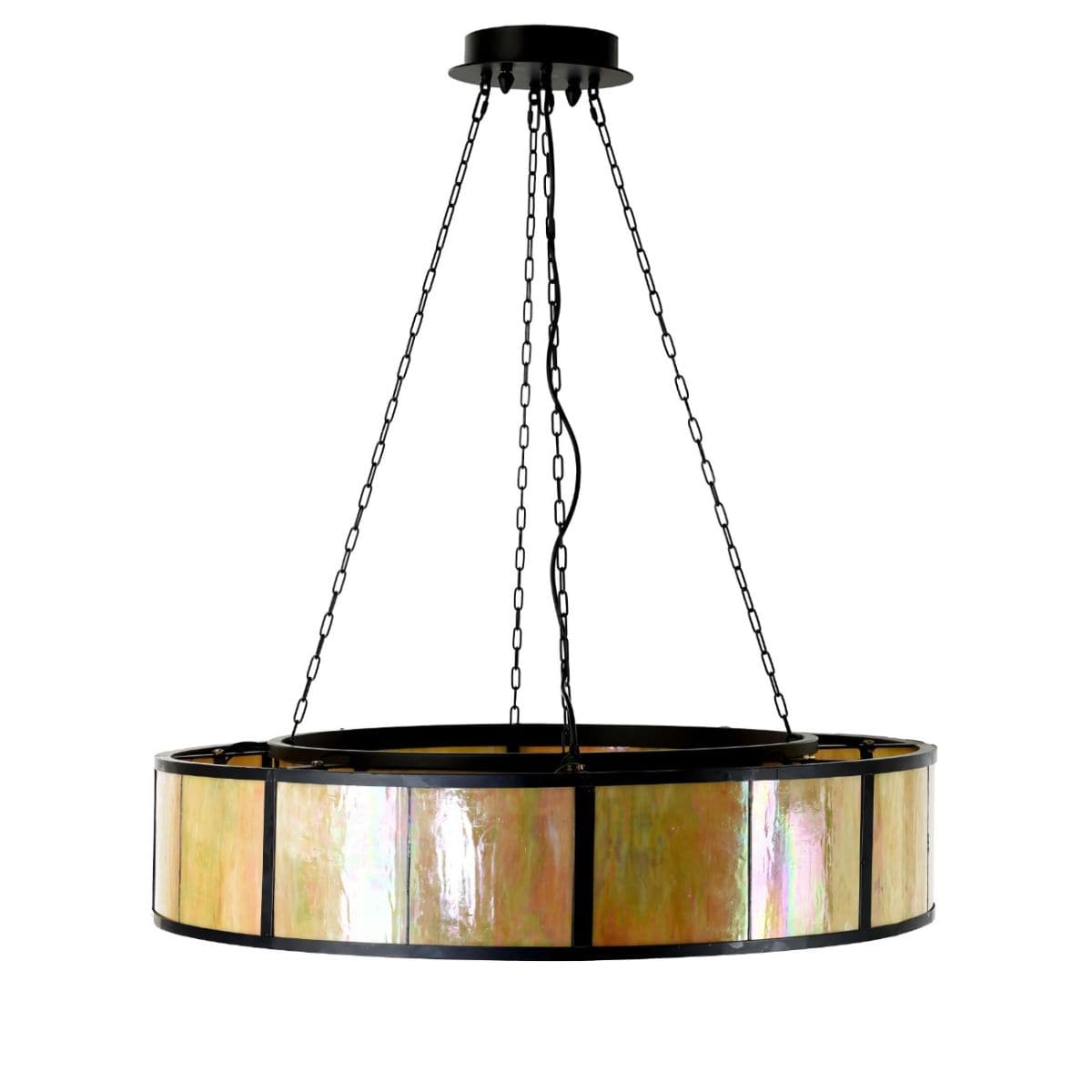 Chaque suspension en verre jaune orangé est réalisée manuellement, garantissant une finition soignée et un rendu lumineux exceptionnel. Les motifs en verre coloré captent et diffusent la lumière de manière harmonieuse, offrant une atmosphère conviviale et chaleureuse. Sa structure robuste et son design rétro-art déco en font un élément décoratif central, idéal pour mettre en valeur votre intérieur tout en apportant une touche de lumière douce et élégante. Parfait pour ceux qui recherchent une pièce maîtresse à la fois fonctionnelle et artistique.
