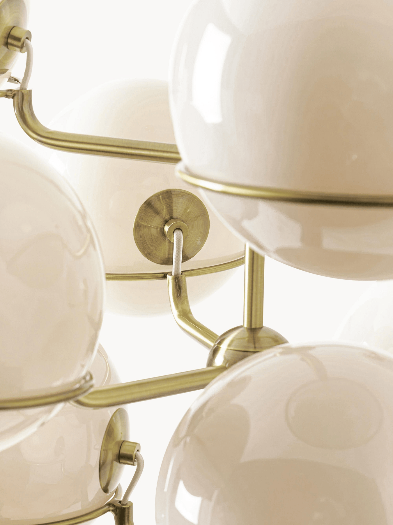 La Boule De Verre Suspension se distingue par son abat-jour en verre blanc crème qui diffuse une lumière douce et agréable. Son corps en métal doré et son rosace en métal apportent une touche de luxe et de modernité à votre intérieur. Son câble à enrobage textile beige complète harmonieusement le design général de cette suspension.