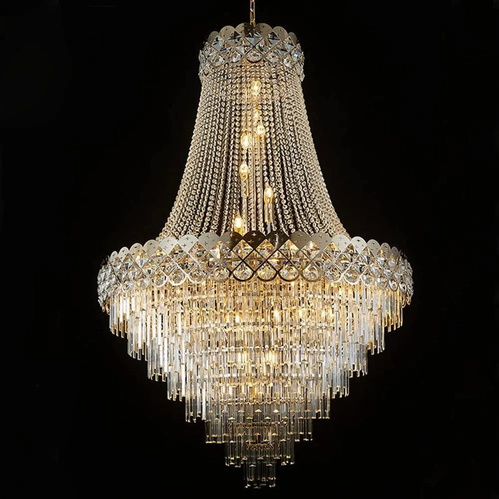 Donnez une touche d'opulence et de grandeur à votre espace avec notre grand lustre chandelier en verre et doré. Cette pièce d'exception est conçue pour être le point focal de votre intérieur, qu'il s'agisse d'un salon avec de hauts plafonds, d'une salle à manger spacieuse, ou d'un hall d'entrée. Son alliance de verre étincelant et de finitions dorées crée un effet luxueux et spectaculaire, digne des plus grands palais.