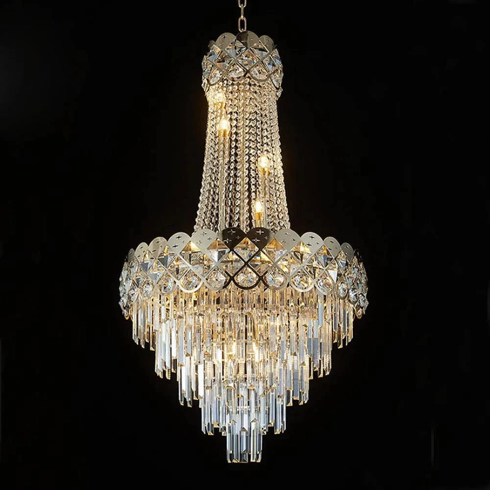 Ce chandelier n'est pas qu'un simple luminaire, c'est une véritable sculpture de lumière. Le jeu de reflets sur le verre et la brillance du métal doré crée un éclairage magique et chaleureux. Parfait pour les intérieurs classiques, modernes ou Art Déco, ce lustre est un investissement intemporel qui rehaussera le prestige de votre propriété.