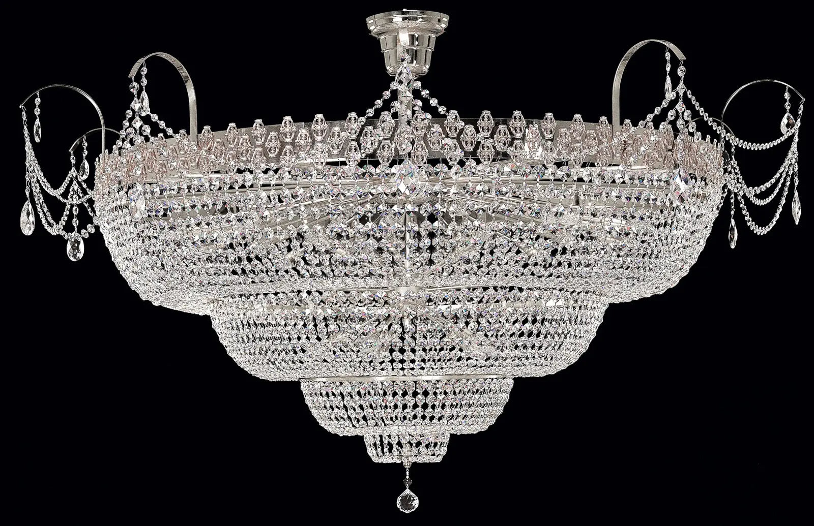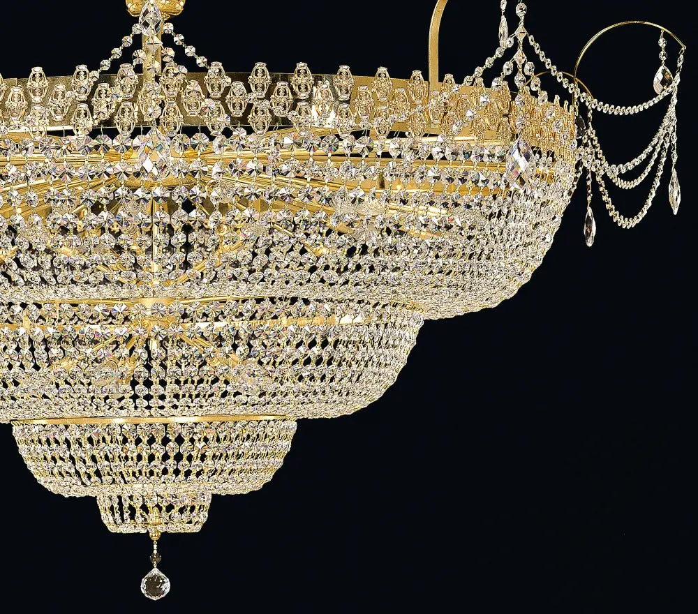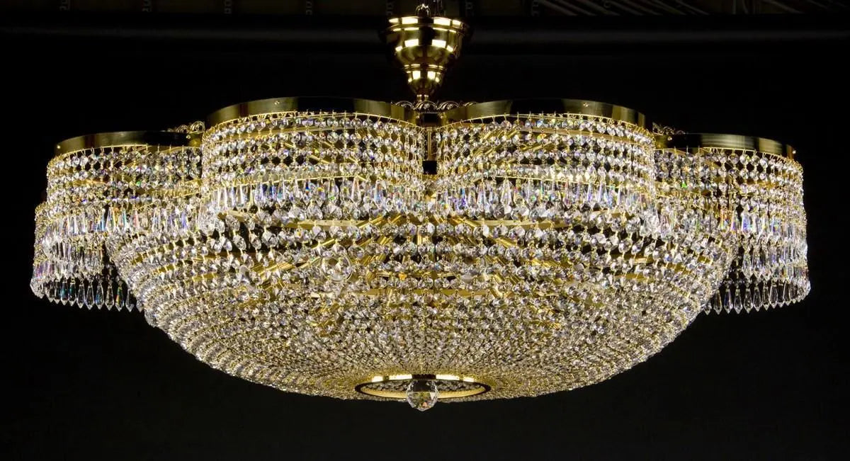 Le plafonnier panier en cristal est une pièce d’éclairage d’exception composée de quatre cascades de pampilles en cristal formant un volume élégant et aérien. Une couronne décorative périphérique, richement ornée de cristal taillé, vient parfaire la partie supérieure du luminaire et accentue son caractère architectural. Conçu pour les grands espaces représentatifs, ce plafonnier diffuse une lumière homogène et raffinée, idéale pour sublimer les volumes imposants et renforcer le prestige des lieux tels que les théâtres, salles de concert, palais ou résidences de luxe.
