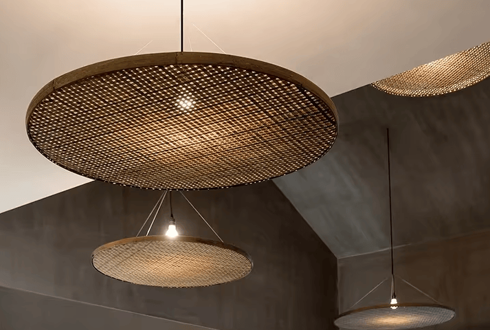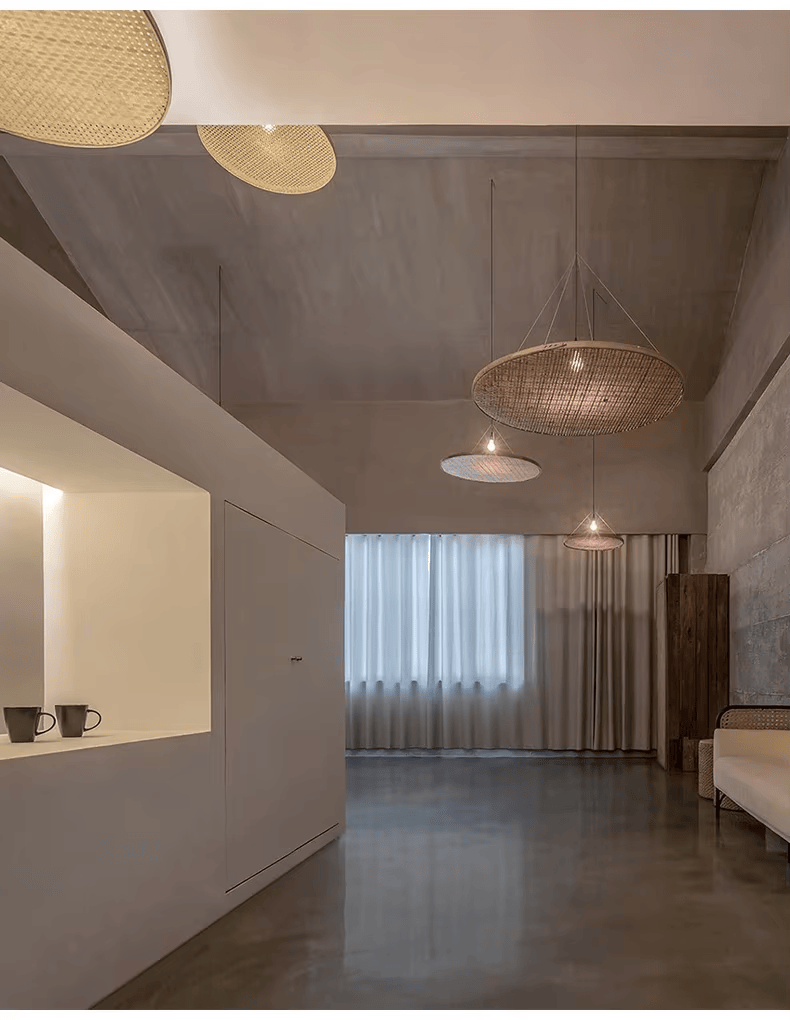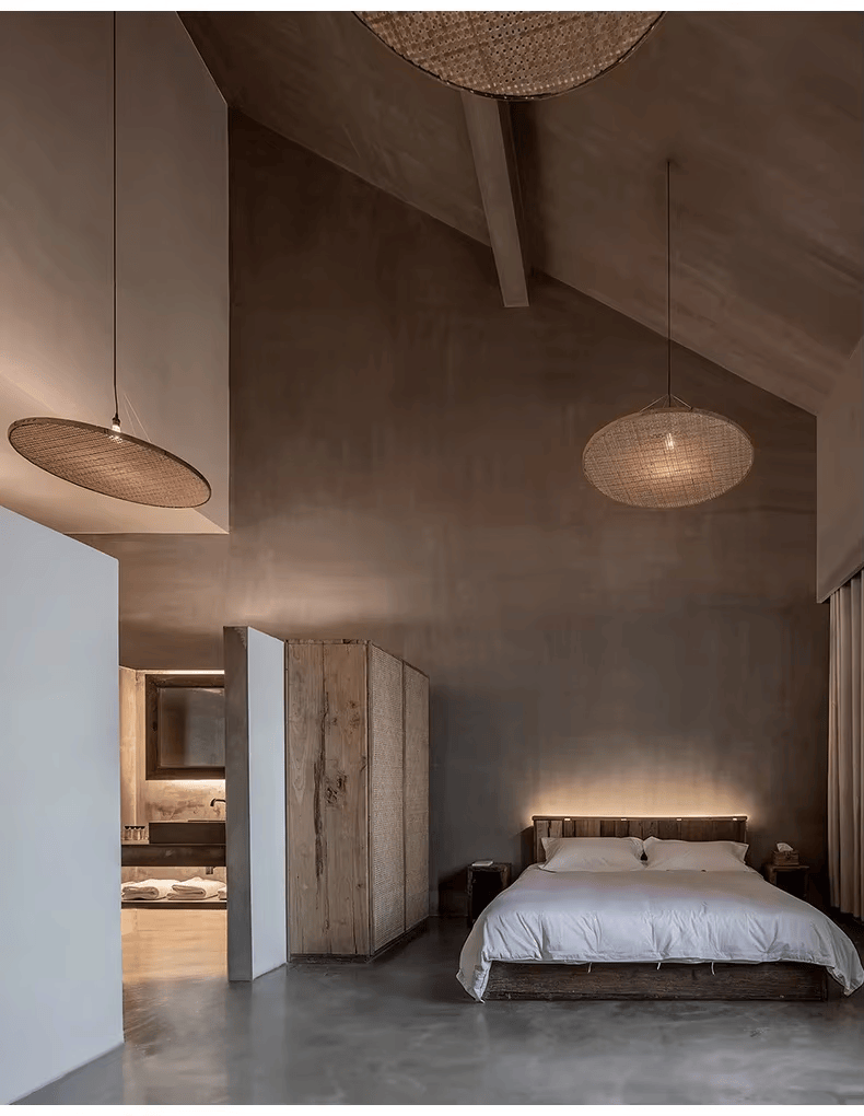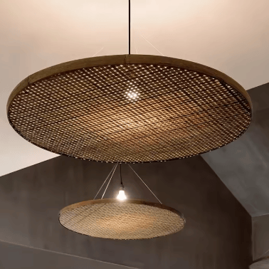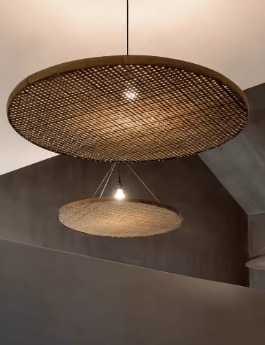 Découvrez une lampe suspendue en rotin au design Wabi Sabi japonais, faite à la main en bambou pour une ambiance naturelle et apaisante dans vos espaces de vie ou professionnels