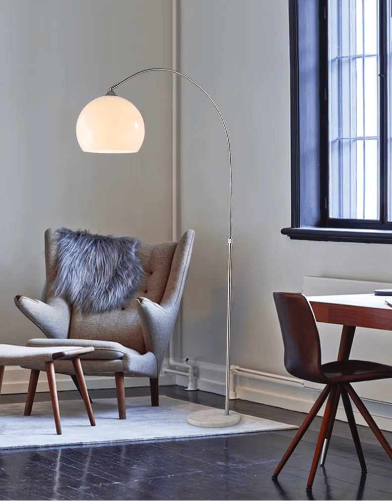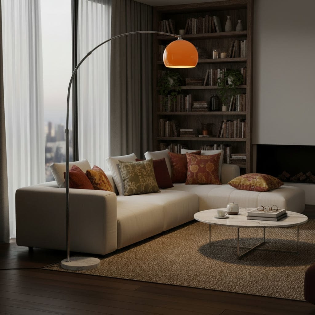 Éclairage intérieur avec lampe arc orange pour salon moderne permettant de créer une atmosphère cosy et accueillante dans votre espace de vie