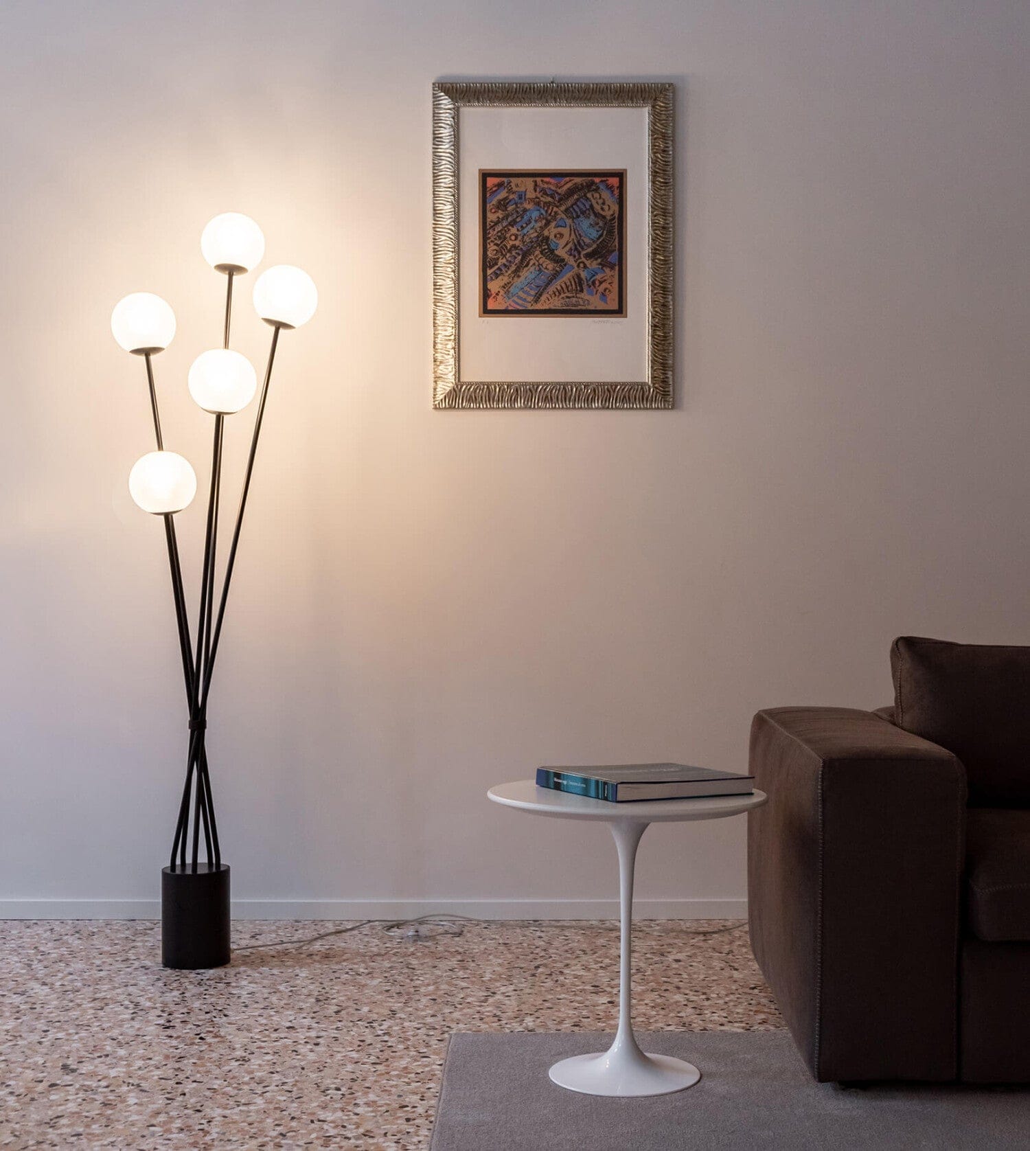 Lampadaire boules blanches décoratif pensé pour valoriser les volumes et créer un éclairage d’ambiance haut de gamme