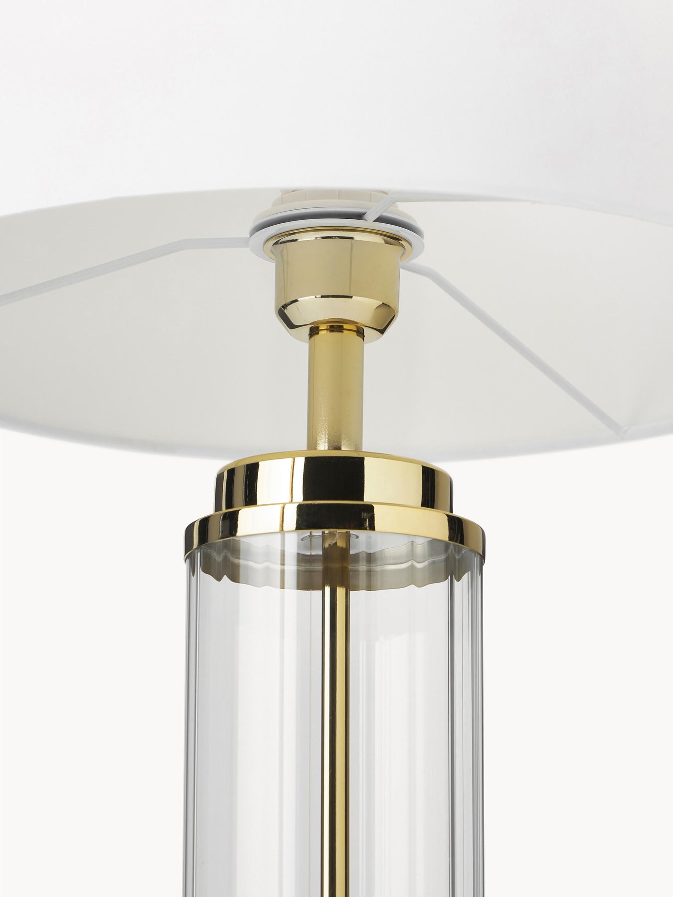 Lampe blanche sur pied élégante avec abat-jour textile et pied en verre transparent ondulé et métal doré pour un intérieur glamour