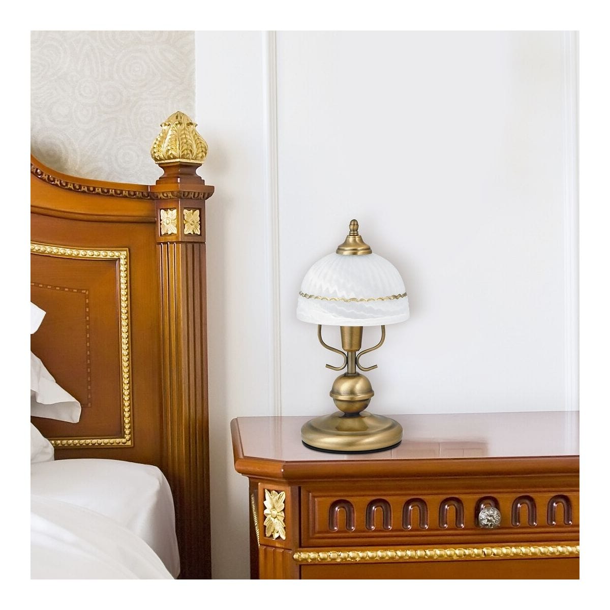 Profitez d’une lampe de chevet ancienne en laiton style château Rabalux série Flossi avec abat-jour en verre blanc et métal marron offrant design classique, robustesse et praticité pour sublimer votre décoration intérieure