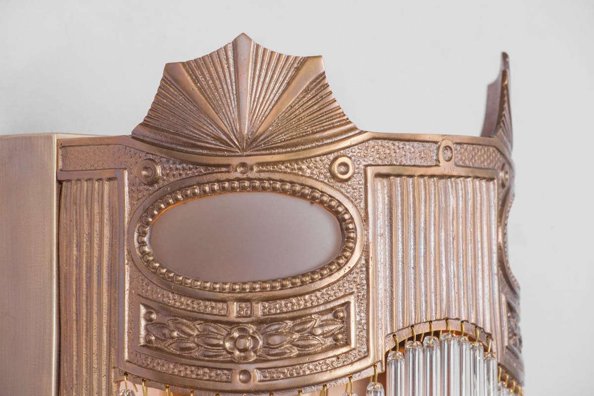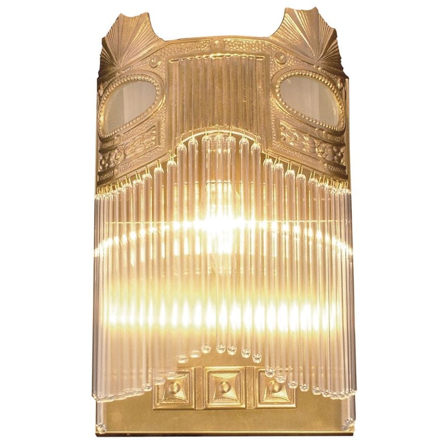 Découvrez une lampe murale rétro ancienne en laiton massif et cristal avec panneaux de verre délicats pour un éclairage chaleureux et un style Art Nouveau unique