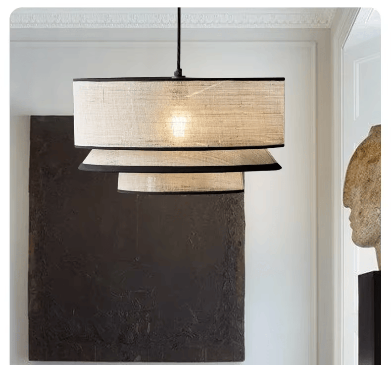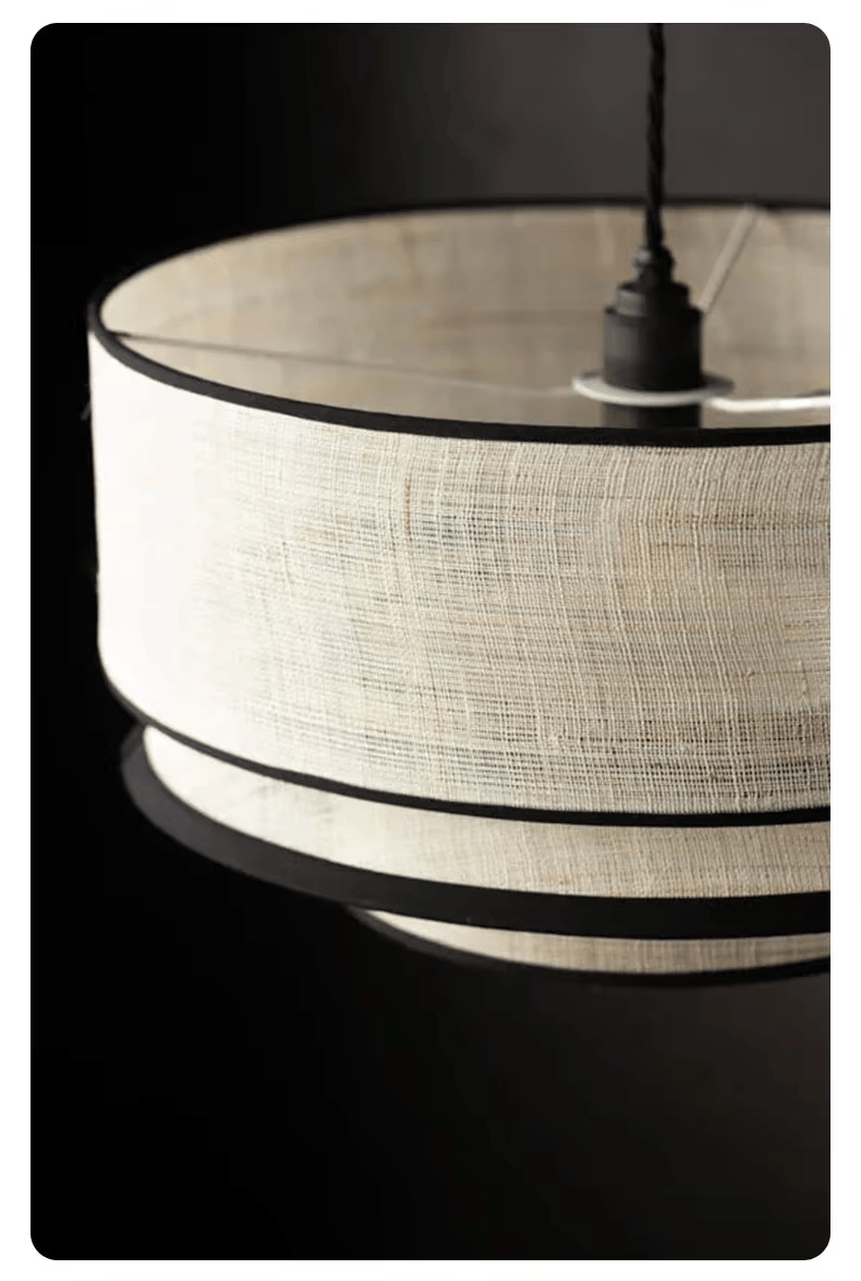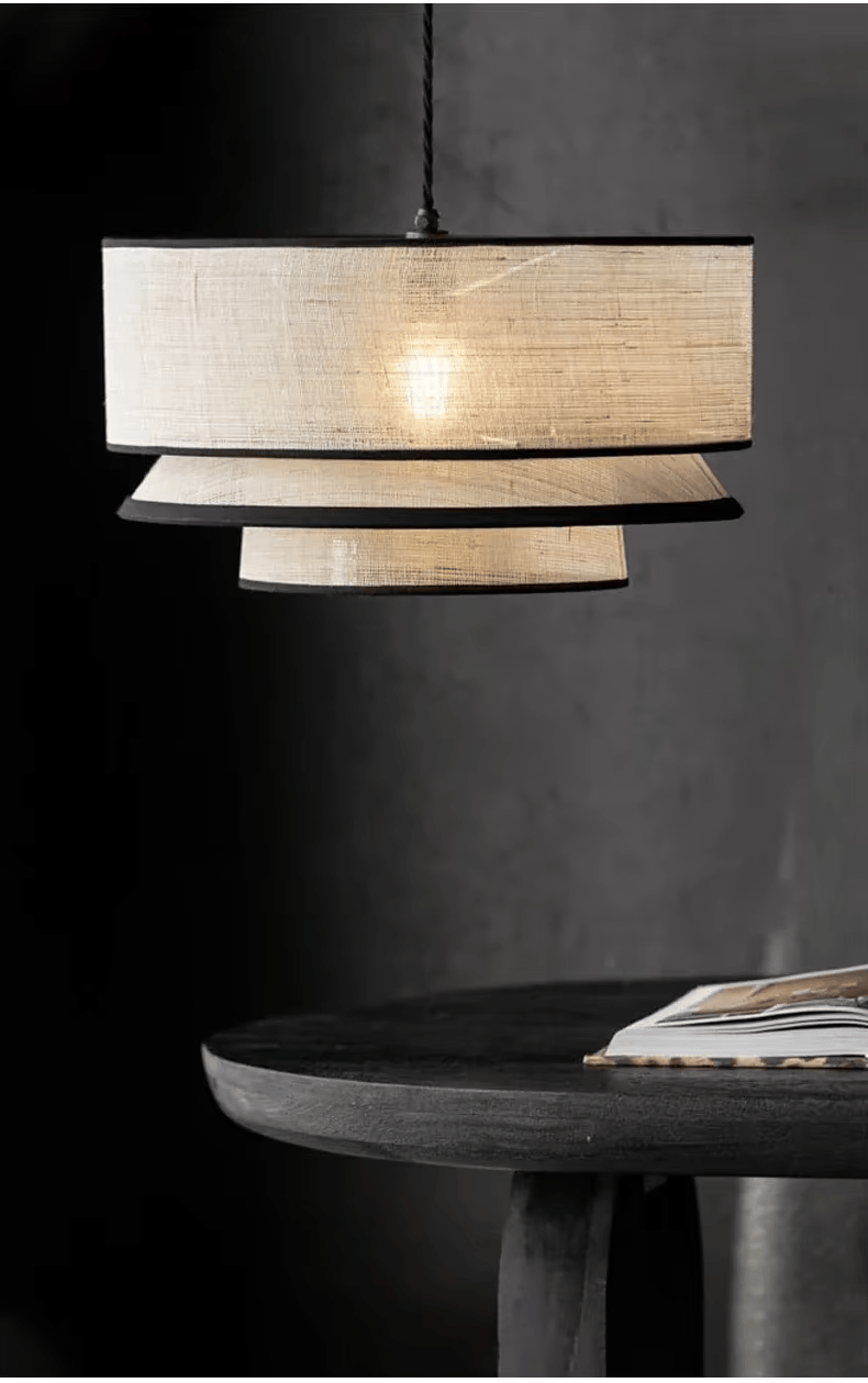 Lustre suspendu design scandinave en tissu beige avec liseré noir, parfait pour une décoration naturelle et équilibrée