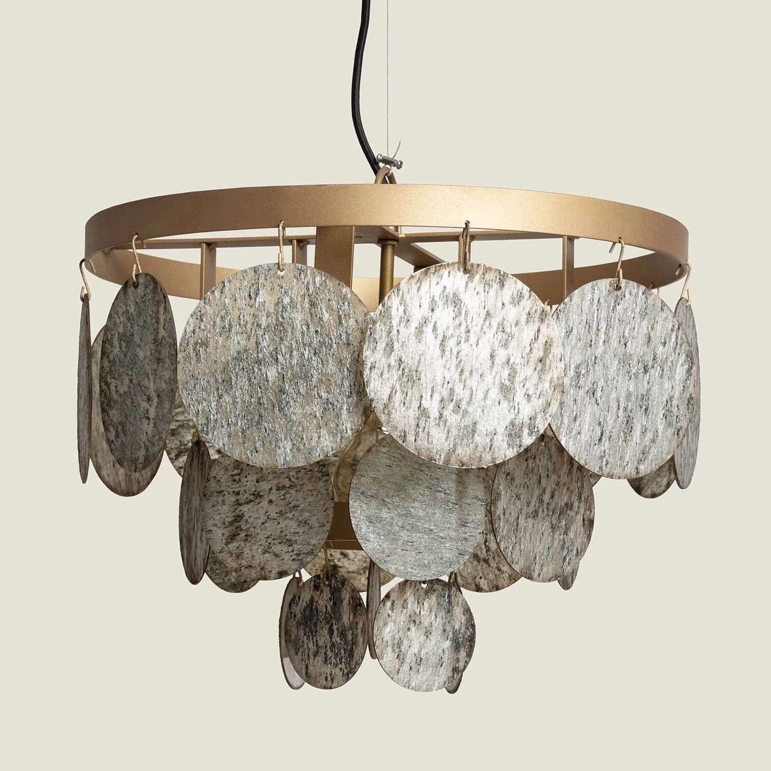 Apportez une touche de design moderne et de sophistication à votre intérieur avec la suspension métal Armin. Réalisée entièrement en métal doré, cette lampe suspendue se distingue par sa composition de disques métalliques irréguliers aux reflets argentés vieillis, créant un jeu de lumière décoratif et dynamique.