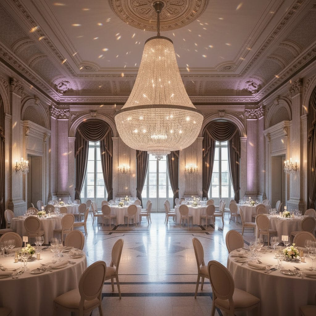 Grand lustre en cristal pour grandes salles de réception avec fabrication européenne et éclairage spectaculaire pour plafonds hauts