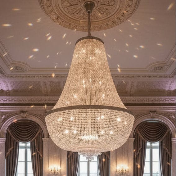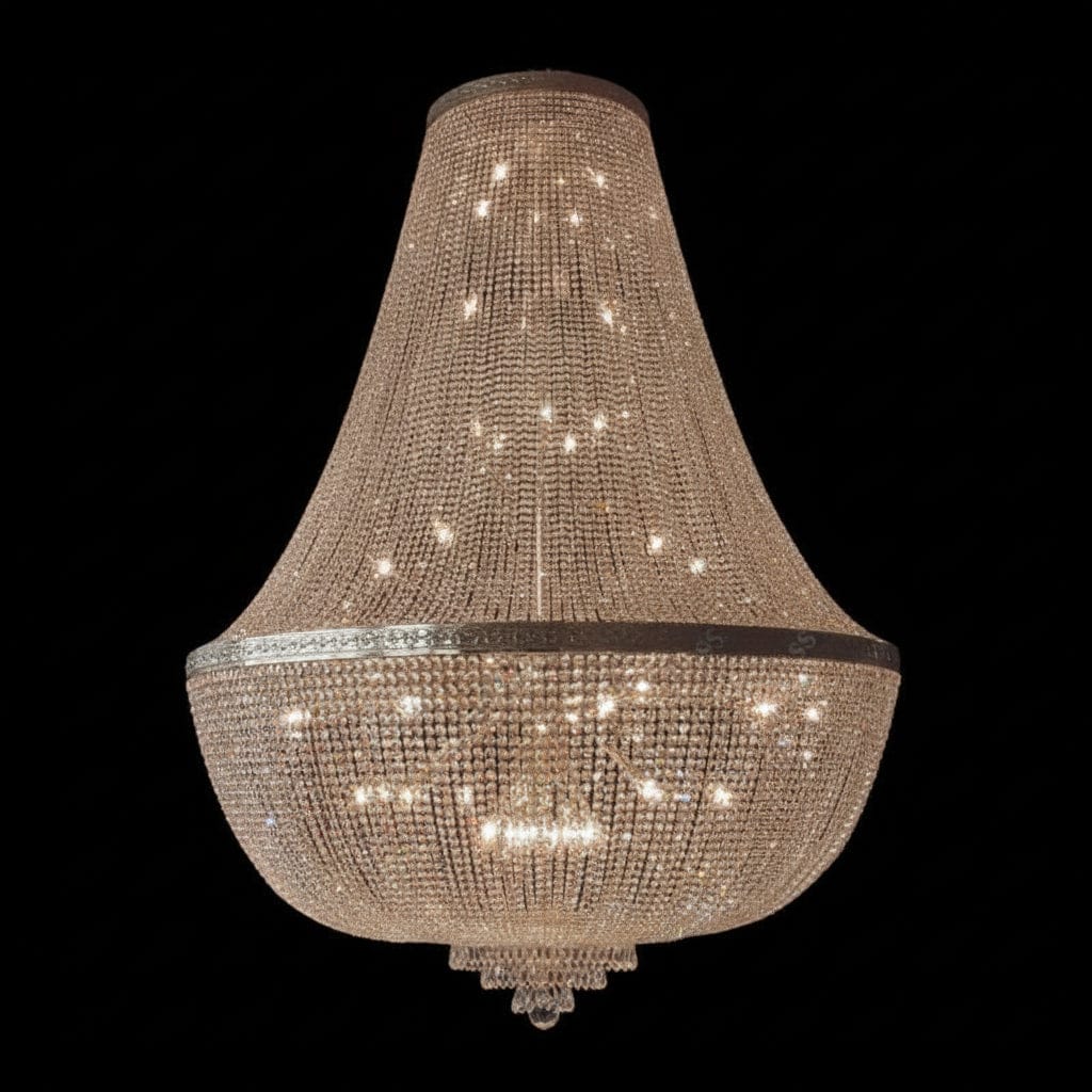 Ce grand lustre en cristal est spécialement conçu pour illuminer les très grands espaces de réception tout en apportant une touche de luxe et de raffinement. Avec ses 86 sources lumineuses, il diffuse une lumière puissante et homogène, parfaite pour halls d’hôtel, palais, salles de concert ou grandes résidences de luxe. Les éléments décoratifs en cristal comprenant gouttes, poires, sabots et prismes reflètent la lumière de manière spectaculaire, créant des jeux de reflets élégants et colorés dans tout l’espace.