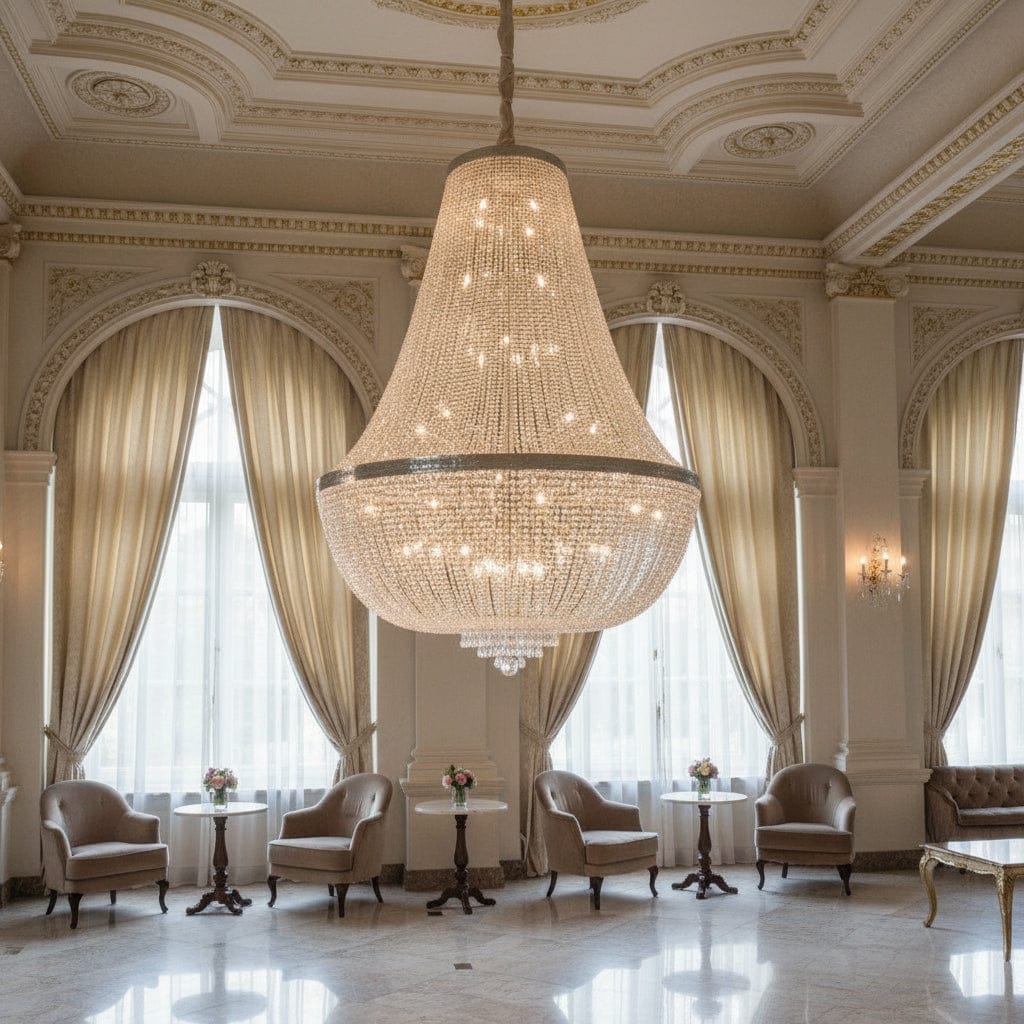 Fabriqué selon un savoir-faire européen, ce lustre de grandes dimensions combine robustesse et esthétique grâce à sa structure métallique et ses ornements en cristal taillé. Adapté aux ERP, ce luminaire assure un éclairage performant et de qualité dans les espaces à forte fréquentation. Sa conception artisanale et sa finition brillante en font un élément central de décoration, valorisant l’architecture et l’élégance des lieux. Ce lustre est idéal pour les projets haut de gamme nécessitant une présence visuelle et lumineuse remarquable.