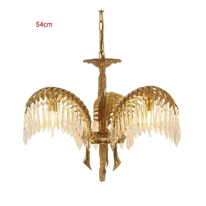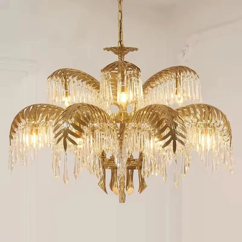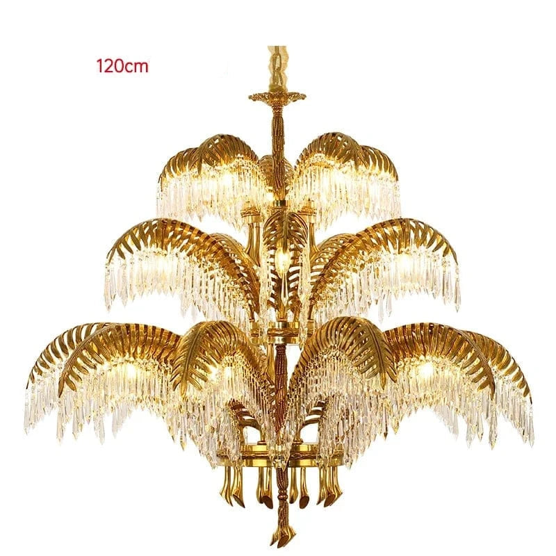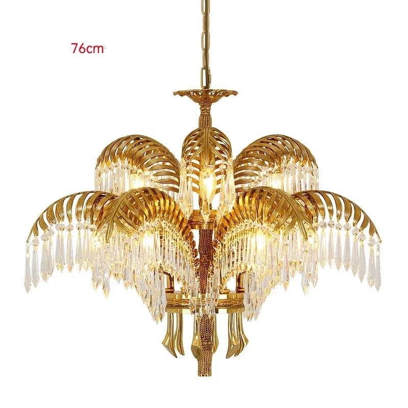 Conçu pour impressionner, ce lustre en laiton doré sculpté rappelle les designs emblématiques des années 1980, période connue pour son goût pour l’exubérance raffinée. Les feuilles de palmier finement ciselées, associées à des cristaux pendants étincelants, offrent un rendu lumineux spectaculaire.