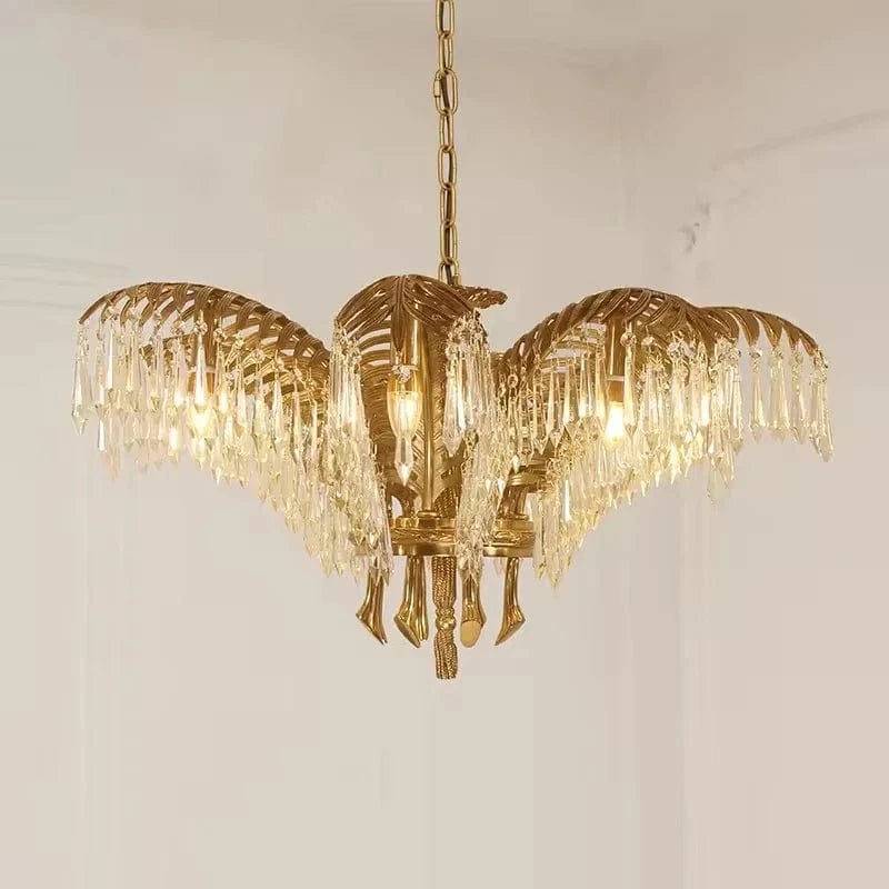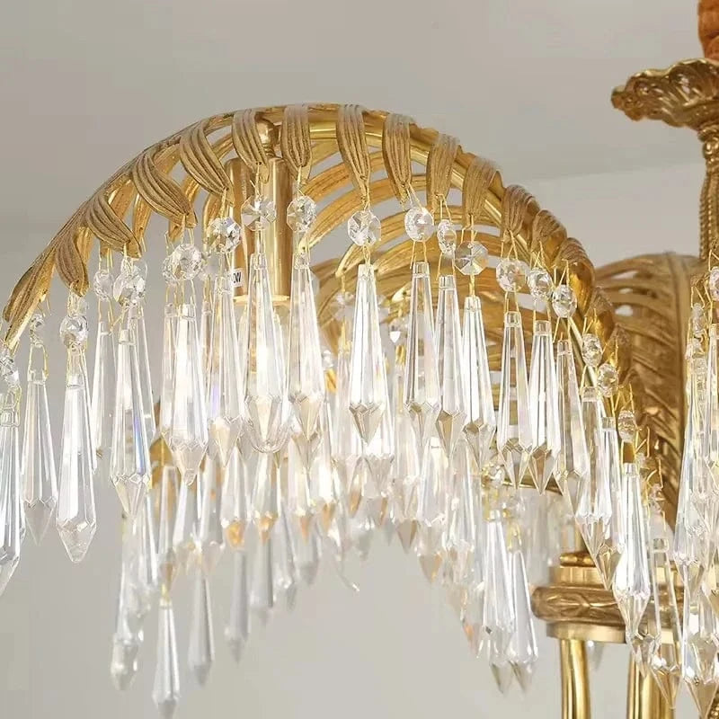 Ce lustre suspendu, riche en détails, est un parfait équilibre entre glamour vintage, artisanat d'art et matériaux nobles. Il combine structure en cuivre massif et pendeloques en cristal pour une diffusion lumineuse élégante, dans une esthétique à la fois rétro et résolument luxueuse.