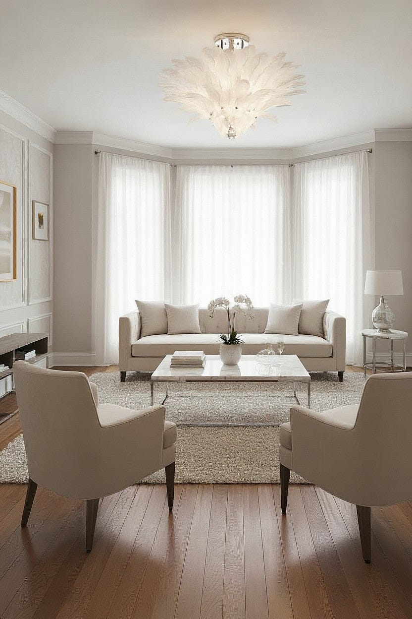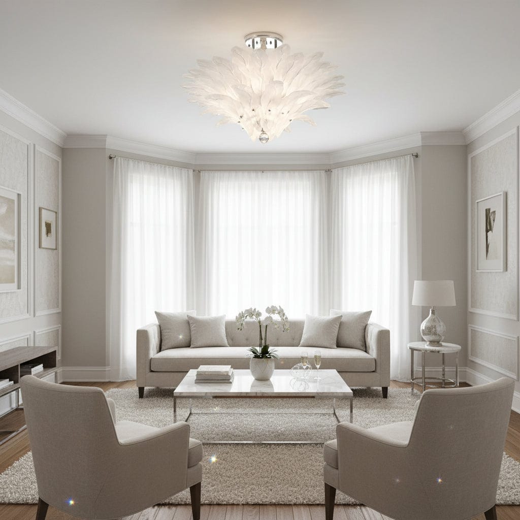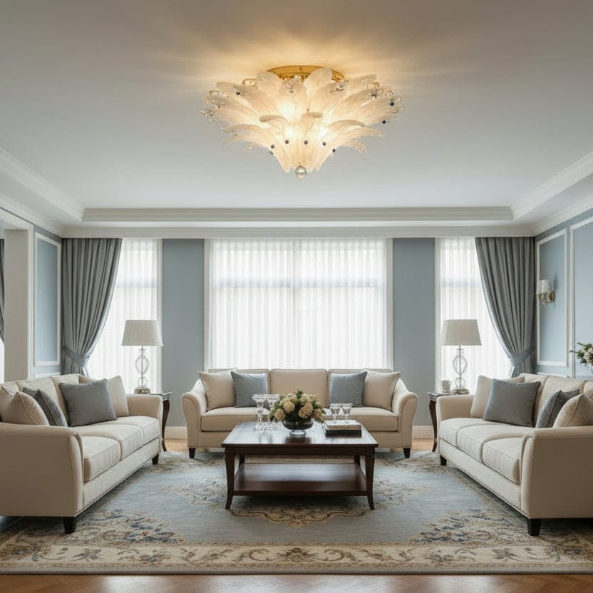 Ce plafonnier design en verre satiné est conçu pour apporter une touche décorative raffinée aux espaces de vie modernes. Ses feuilles en verre transparent ou satiné diffusent la lumière de manière douce et homogène, créant une ambiance chaleureuse et élégante. La structure en métal finition nickel brillant ou or renforce le caractère premium de ce luminaire de plafond, parfaitement adapté au salon, à la salle à manger ou à une chambre contemporaine. Grâce à ses ampoules LED E14, ce plafonnier combine performance lumineuse et efficacité énergétique pour un usage quotidien.