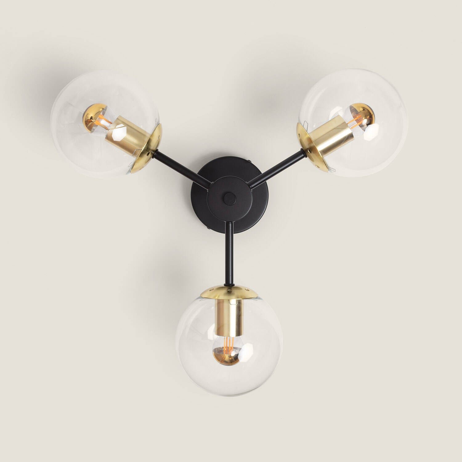 Plafonnier Métal et Verre moderne avec 3 globes transparents et finitions noir et doré, idéal pour salons, chambres ou espaces d’accueil