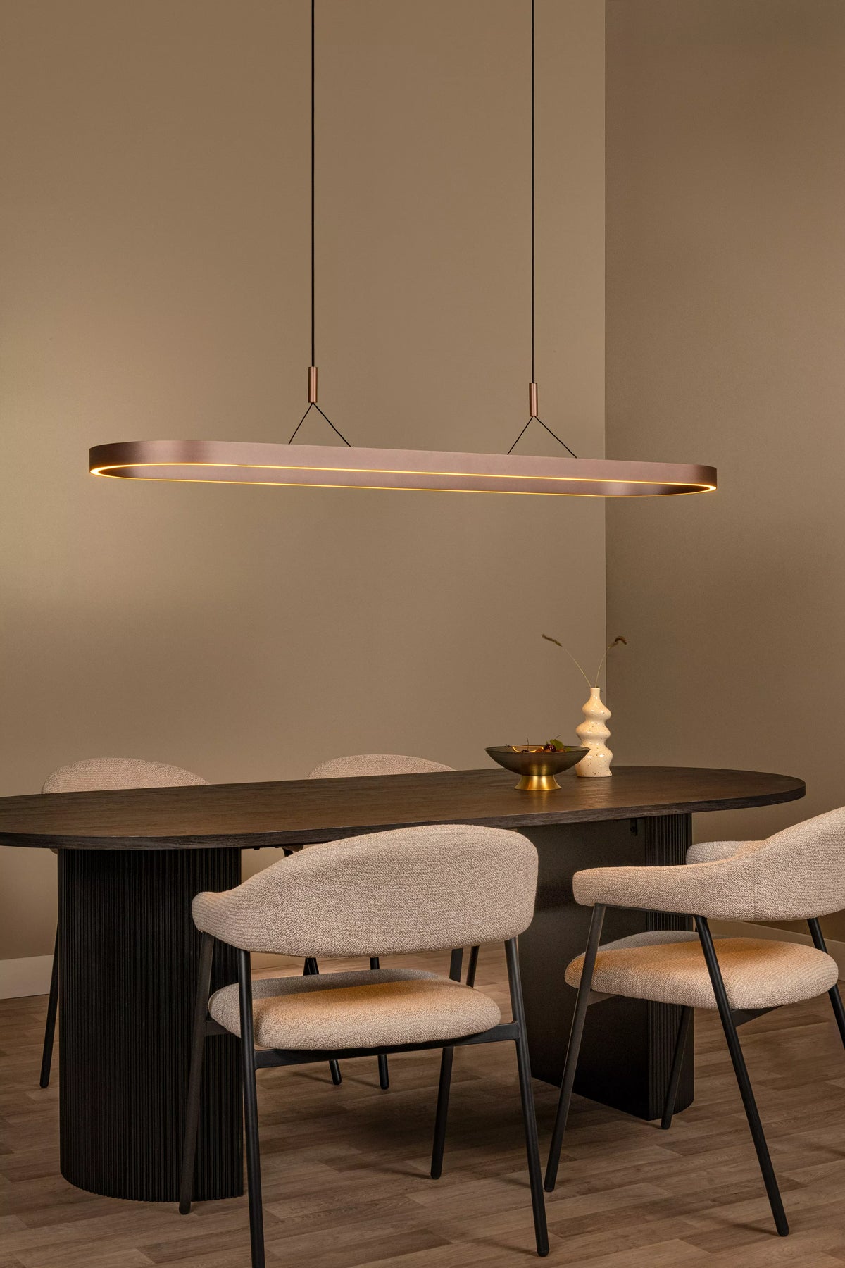 Avec sa diffusion lumineuse large et son design ovale, cette suspension est parfaite pour éclairer de longues surfaces comme une table de salle à manger ou un plan de travail. La lumière LED intégrée offre une luminosité puissante, douce et homogène, tout en permettant le réglage de la teinte lumineuse pour un confort optimal. Le variateur externe (non fourni) permet d’ajuster l’intensité. Ce luminaire moderne constitue un choix idéal pour ceux qui recherchent un style épuré, une lumière modulable et un système de réglage pratique.