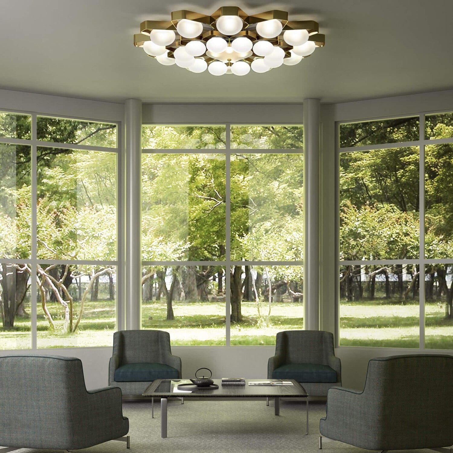 Le plafonnier design Teo 2392/140 séduit par son esthétique élégante et minimaliste, parfaitement adaptée aux intérieurs modernes et architecturaux. Ses diffuseurs en verre soufflé satiné offrent une lumière douce, homogène et non éblouissante, idéale pour créer une ambiance raffinée et accueillante. La structure en métal avec finition or ou or nickel apporte une touche luxueuse et contemporaine, faisant de ce plafonnier un élément décoratif central pour les grands salons, salles à manger ou espaces professionnels haut de gamme.