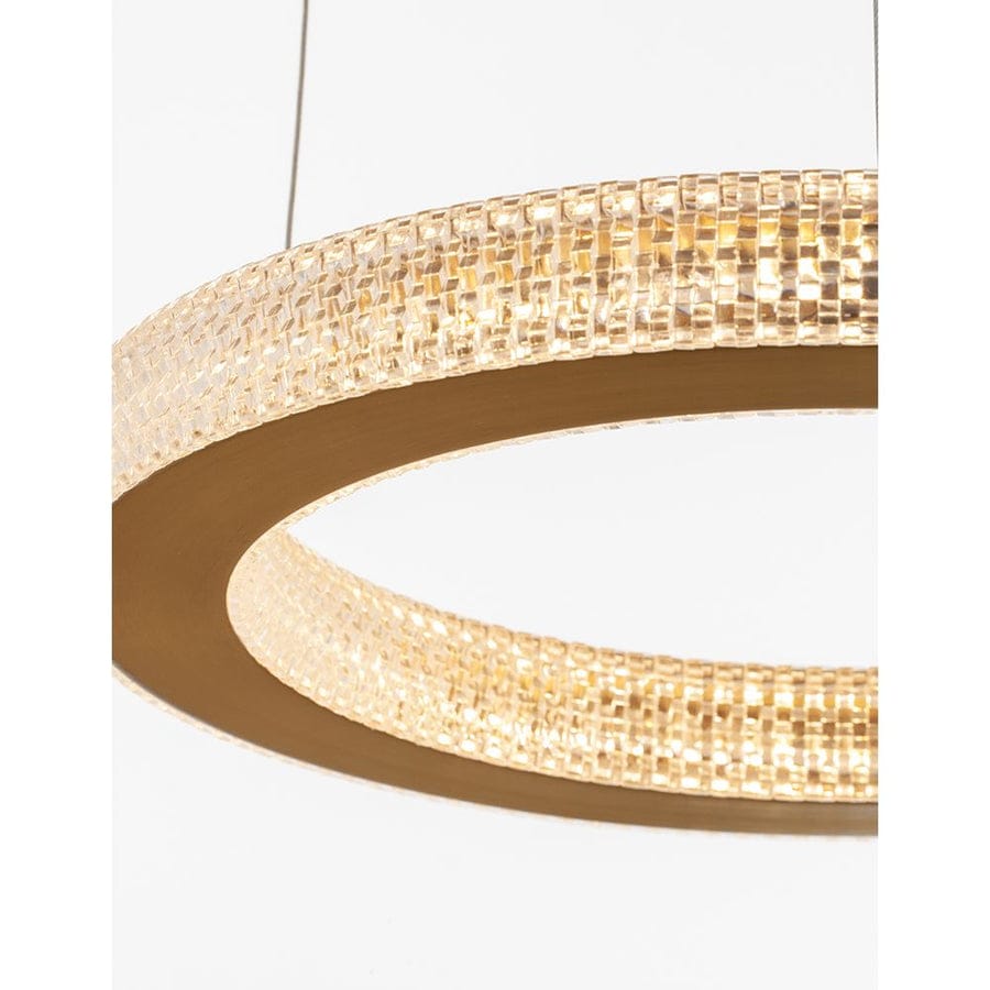 Cette suspension dorée en aluminium et verre acrylique illustre la rencontre entre technologie LED moderne et esthétique intemporelle. Son fini or antique capte subtilement la lumière, diffusant des reflets chaleureux et luxueux.