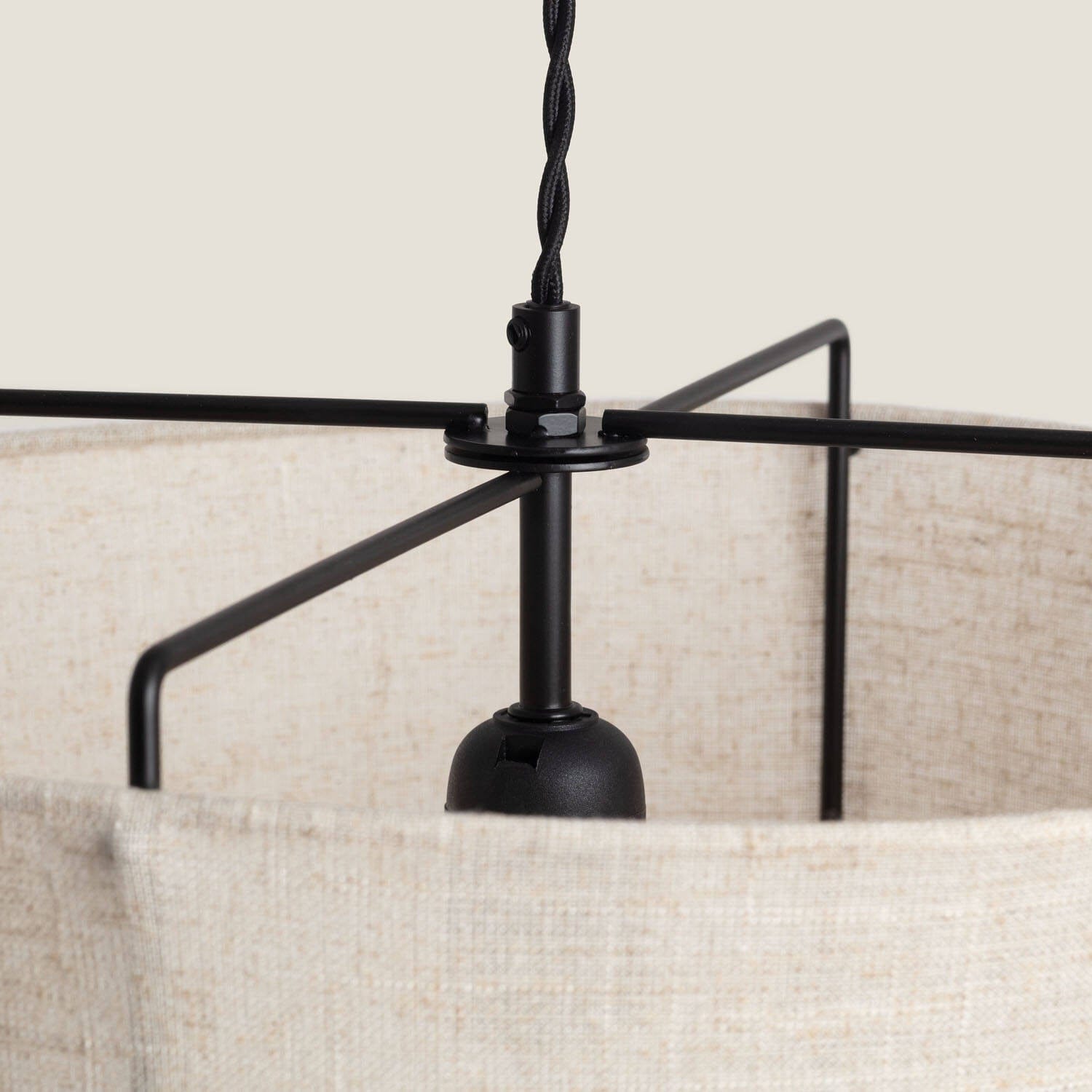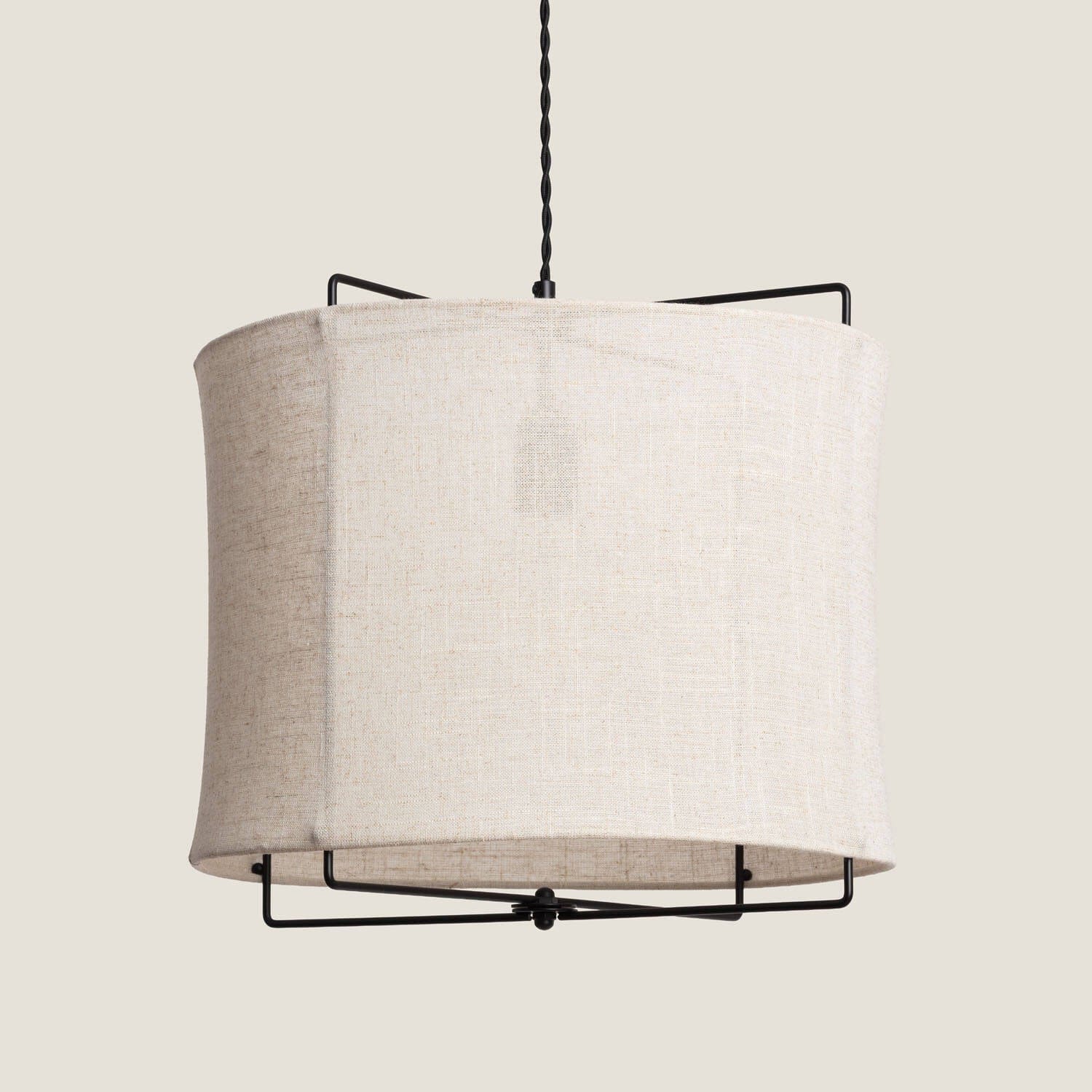Une suspension japonaise design en tissu blanc cassé et structure noire pour une ambiance zen et contemporaine dans votre salon ou chambre